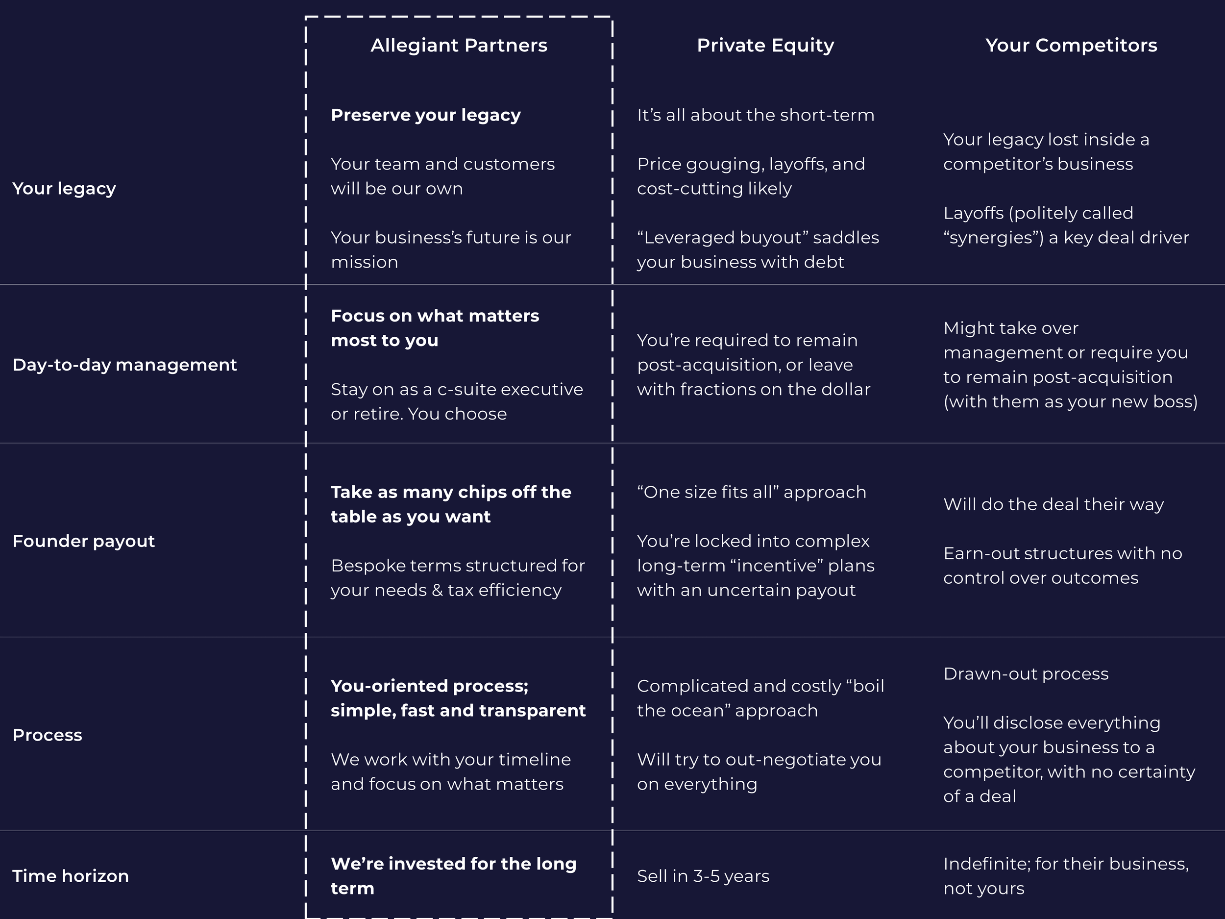 You love your business, and so will we. As long-term owners, will preserve and expand your company, staying loyal to your team and your customers.